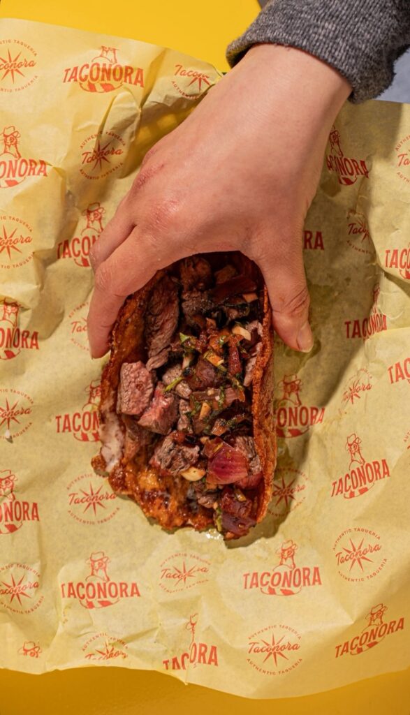 “Guests start by choosing their protein,” she explains, pointing to options like asada, pork belly, chicken made with a house seasoning mix, trompo-style ribeye or sirloin steak, or grilled Anaheim chiles. Then they can choose if they want it as a regular taco, lorenza (an open-faced, crispy taco), caramelo (a Sonoran specialty where carne asada and melted cheese are sandwiched between two crispy flour tortillas), costra (a “crust” of caramelized cheese wrapped around the chosen filling), a Sonoran-style burrito, or TacoNora’s signature taco pizza.